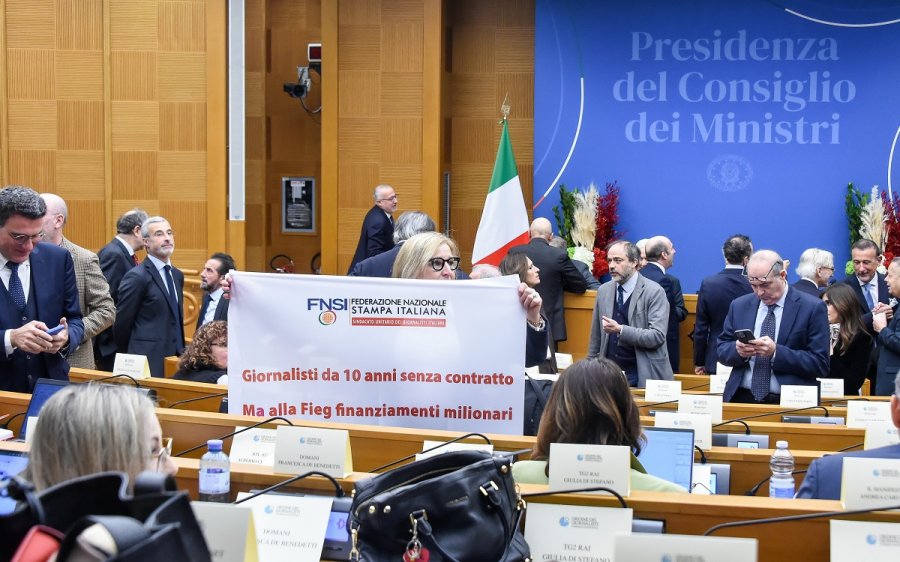 «Giornalisti da 10 anni senza contratto ma alla Fieg finanziamenti milionari»: è il testo di un piccolo striscione mostrato da Alessandra Costante, segretaria generale della Federazione nazionale della Stampa italiana, insieme con il presidente della Fnsi, Vittorio di Trapani, nell’aula dei Gruppi parlamentari della Camera in apertura della conferenza stampa di ‘inizio anno’ della premier Giorgia Meloni, organizzata dal Consiglio nazionale dell’Ordine dei giornalisti in collaborazione con l’Associazione della stampa parlamentare, venerdì 9 gennaio 2026.