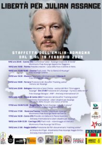 L’Emilia Romagna si mobilita per Julian Assange. E Aser c’è. Gli attivisti del movimento per Assange in collaborazione con Amnesty International Emilia Romagna e altre associazioni presenti nel territorio fino al 19 febbraio saranno impegnati in una maratona speciale, che coinvolgerà diverse realtà della nostra regione, compreso il capoluogo, per chiedere a gran voce la liberazione del fondatore di WikiLeaks. Si tratta di una maratona di eventi, uno per ognuno dei territori interessati, per favorire la crescita di consapevolezza di cittadine e cittadini sul caso Assange e sulle sue implicazioni. La staffetta ha preso il via venerdì 9 febbraio a Casina (Re), con una conferenza promossa da Free Assange Appennino Reggiano, in collaborazione con l’amministrazione comunale; sabato 10 mattina è proseguita a Parma con un “Presidio creativo” promosso da Donne in Nero e Casa delle Pace; e il 10 pomeriggio a Cesena, dove Free Assange Cesena ha realizzato un flash mob; lunedì 12 a Modena gli attivisti Free Assange Modena allestiranno un banchetto informativo per la cittadinanza; martedì 13 sarà la volta di Ferrara dove gli attivisti Ferrara per Assange hanno optato per la proiezione del film documentario “Hacking Justice”; giovedì 15 a Bologna il Movimento Free Assange Bologna ha organizzato un’intervista a Sara Chessa, giornalista e autrice del libro “Distruggere Assange. Per farla finita con la libertà d’informazione”, cui seguirà la proiezione del documentario “Julian Assange. Il prezzo della verità”; sempre giovedì 15 a Pieve Cento (BO) alle 20,30 proiezione del docufilm “Hacking Justice” organizzato da Liberi cittadini per Assange; sabato 17 al mattino a Reggio Emilia è previsto un sit con letture nella piazza del mercato contadino, organizzato dal Movimento Free Assange Reggio Emilia e da Amnesty Reggio Emilia; mentre nel pomeriggio di sabato 17 a Ravenna sarà organizzato un presidio di fronte al municipio a cura di Movimento Free Assange Ravenna e Faenza. La staffetta proseguirà domenica 18 a Cavriago (Re) con flash mob e volantinaggio al mercato, organizzati dal Movimento della Val d’Enza e si concluderà lunedì 19 a Reggio Emilia, con la proiezione del film documentario “Hacking justice” al Circolo ARCI Pigal organizzato dal Movimento Free Assange Reggio Emilia..