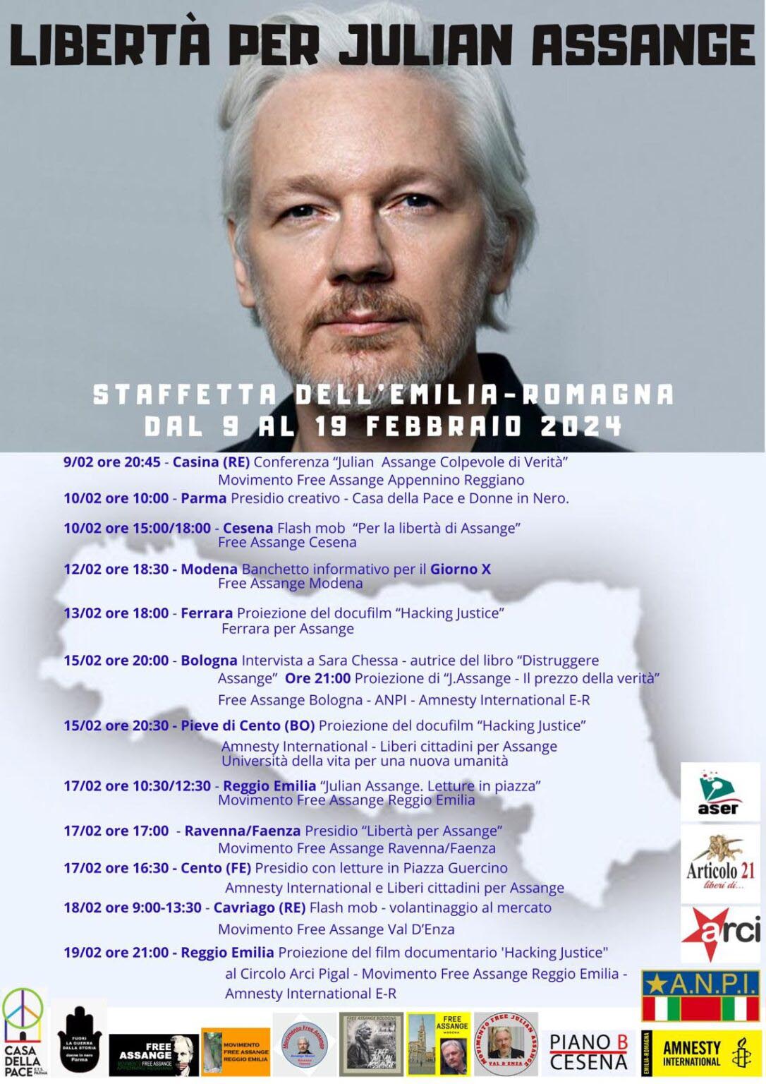 L’Emilia Romagna si mobilita per Julian Assange. E Aser c’è. Gli attivisti del movimento per Assange in collaborazione con Amnesty International Emilia Romagna e altre associazioni presenti nel territorio fino al 19 febbraio saranno impegnati in una maratona speciale, che coinvolgerà diverse realtà della nostra regione, compreso il capoluogo, per chiedere a gran voce la liberazione del fondatore di WikiLeaks. Si tratta di una maratona di eventi, uno per ognuno dei territori interessati, per favorire la crescita di consapevolezza di cittadine e cittadini sul caso Assange e sulle sue implicazioni. La staffetta ha preso il via venerdì 9 febbraio a Casina (Re), con una conferenza promossa da Free Assange Appennino Reggiano, in collaborazione con l’amministrazione comunale; sabato 10 mattina è proseguita a Parma con un “Presidio creativo” promosso da Donne in Nero e Casa delle Pace; e il 10 pomeriggio a Cesena, dove Free Assange Cesena ha realizzato un flash mob; lunedì 12 a Modena gli attivisti Free Assange Modena allestiranno un banchetto informativo per la cittadinanza; martedì 13 sarà la volta di Ferrara dove gli attivisti Ferrara per Assange hanno optato per la proiezione del film documentario “Hacking Justice”; giovedì 15 a Bologna il Movimento Free Assange Bologna ha organizzato un’intervista a Sara Chessa, giornalista e autrice del libro “Distruggere Assange. Per farla finita con la libertà d’informazione”, cui seguirà la proiezione del documentario “Julian Assange. Il prezzo della verità”; sempre giovedì 15 a Pieve Cento (BO) alle 20,30 proiezione del docufilm “Hacking Justice” organizzato da Liberi cittadini per Assange; sabato 17 al mattino a Reggio Emilia è previsto un sit con letture nella piazza del mercato contadino, organizzato dal Movimento Free Assange Reggio Emilia e da Amnesty Reggio Emilia; mentre nel pomeriggio di sabato 17 a Ravenna sarà organizzato un presidio di fronte al municipio a cura di Movimento Free Assange Ravenna e Faenza. La staffetta proseguirà domenica 18 a Cavriago (Re) con flash mob e volantinaggio al mercato, organizzati dal Movimento della Val d’Enza e si concluderà lunedì 19 a Reggio Emilia, con la proiezione del film documentario “Hacking justice” al Circolo ARCI Pigal organizzato dal Movimento Free Assange Reggio Emilia..